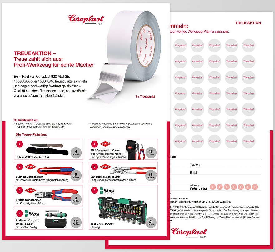 Unser Lieferant Coroplast hat sich für seine Kunden aus der Isolierbranche ein besonderes Dankeschön einfallen lassen: Wenn Du von Coroplast Tape Aluminiumklebebänder wie Coroplast 930 ALU SE, 1530 AWX oder 1560 AWX kaufst, hast du die Möglichkeit, Treuepunkte zu sammeln. Diese kannst du dann gegen Markenwerkzeuge (z. B. von Wera und Knipex) eintauschen.